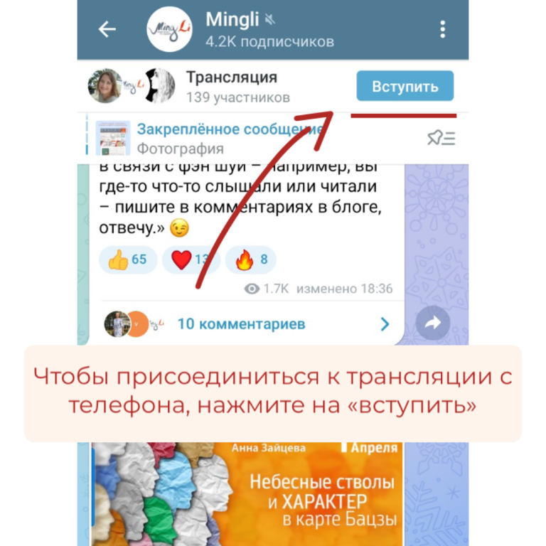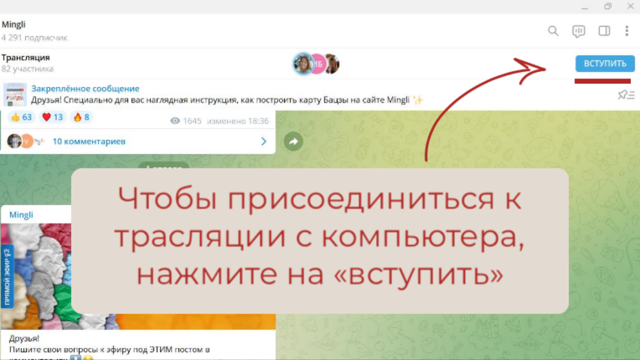 Now let's figure out how to join the broadcast through the mobile version of Telegram. See photo instructions below.